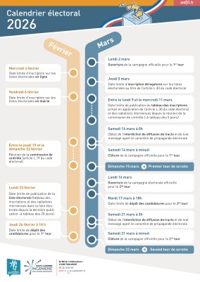 Afin de mieux se repérer dans les multiples échéances qui précèdent les deux tours du scrutin communal et intercommunal des 15 et 22 mars prochains, HGI-ATD propose un calendrier électoral dressant sous forme de schéma un récapitulatif des différentes dates à respecter.